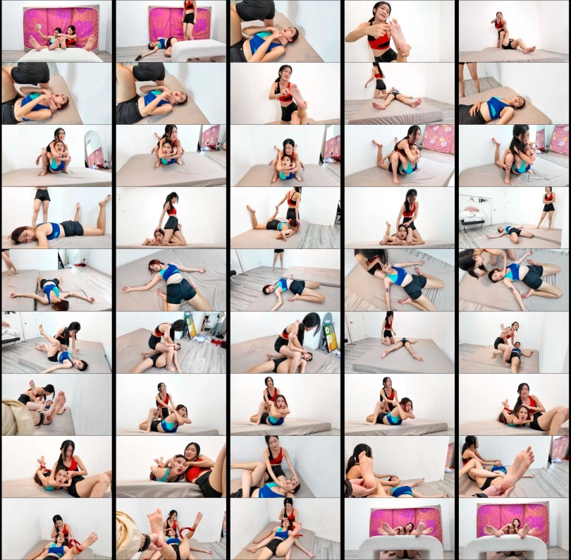 Anna (Red top) completely dominates and destroys poor Rose with various wrestling moves and humiliates Rose