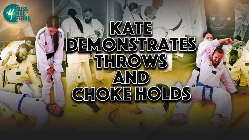 Kate demonstrates various throwing techniques from different angles. She also demonstrates choke hold techniques.